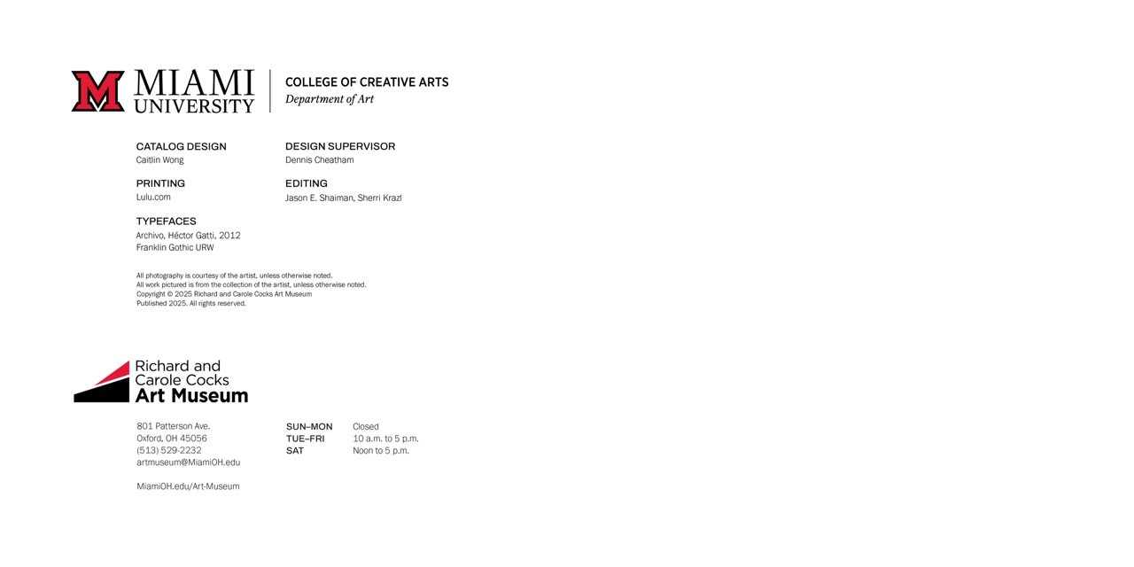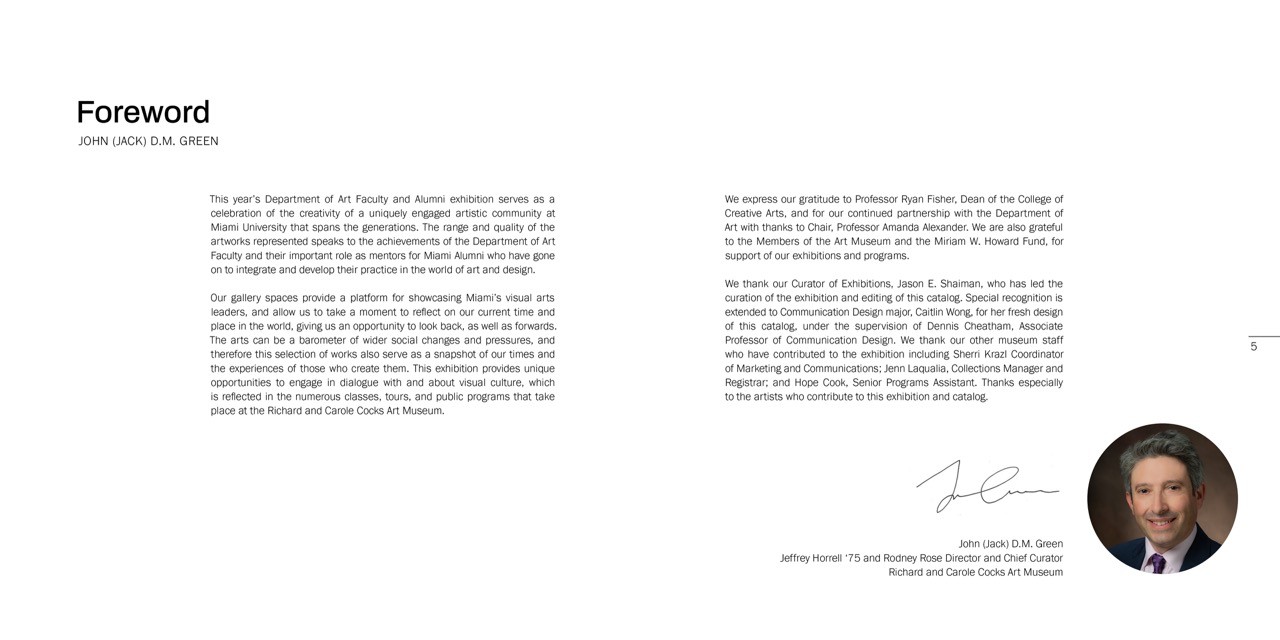I designed an 88-page catalog and brand system for the Richard and Carole Cocks Art Museum for their quadrennial Faculty & Alumni Exhibition. This exhibition features the work of 18 faculty, 7 emeriti, 14 alumni from Miami University.