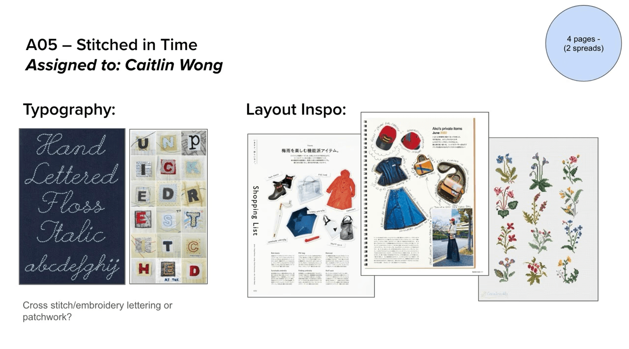 Because I knew photographic elements were going to be pretty simple, I wanted to put a lot of time into the title graphic. I used some scrap fabric to cut each stitch all of the letters, which I then edited in photoshop to match the magazine color palette. I added some strands of thread to reinforce the "stitching" motif and make the layout feel more cohesive.